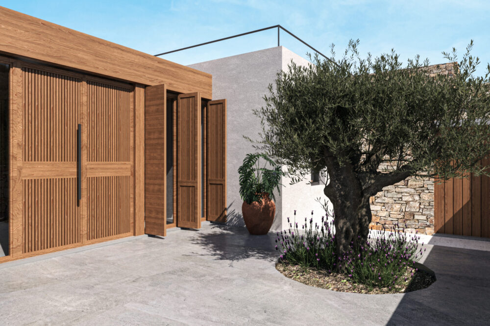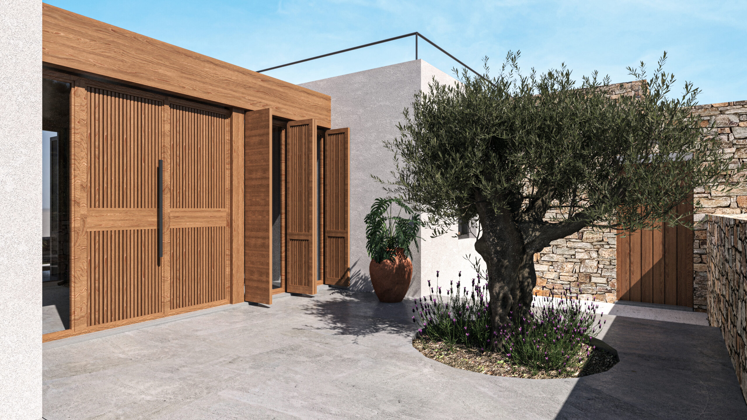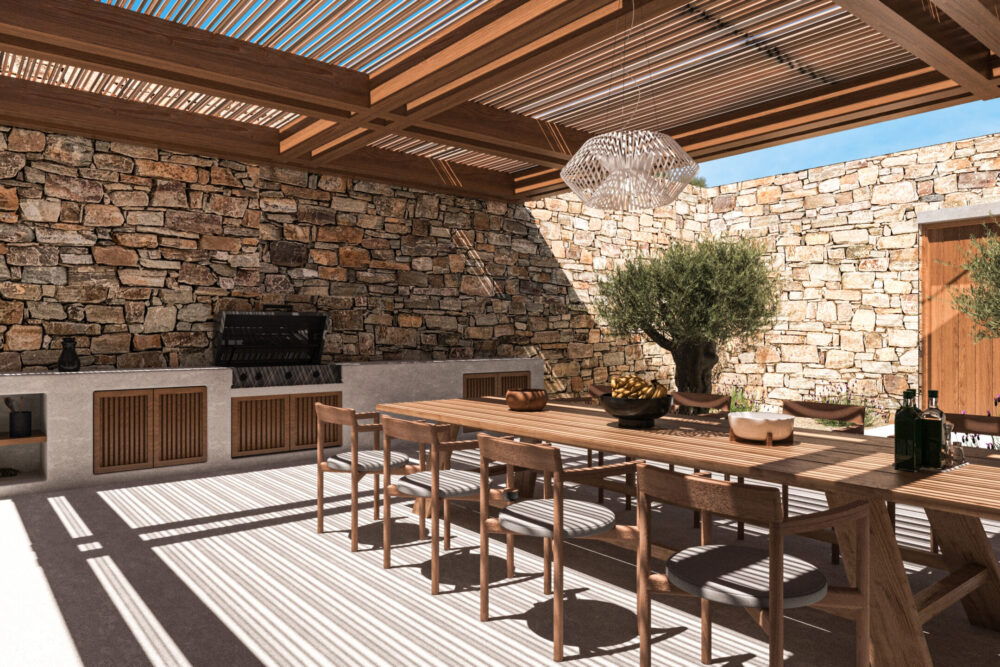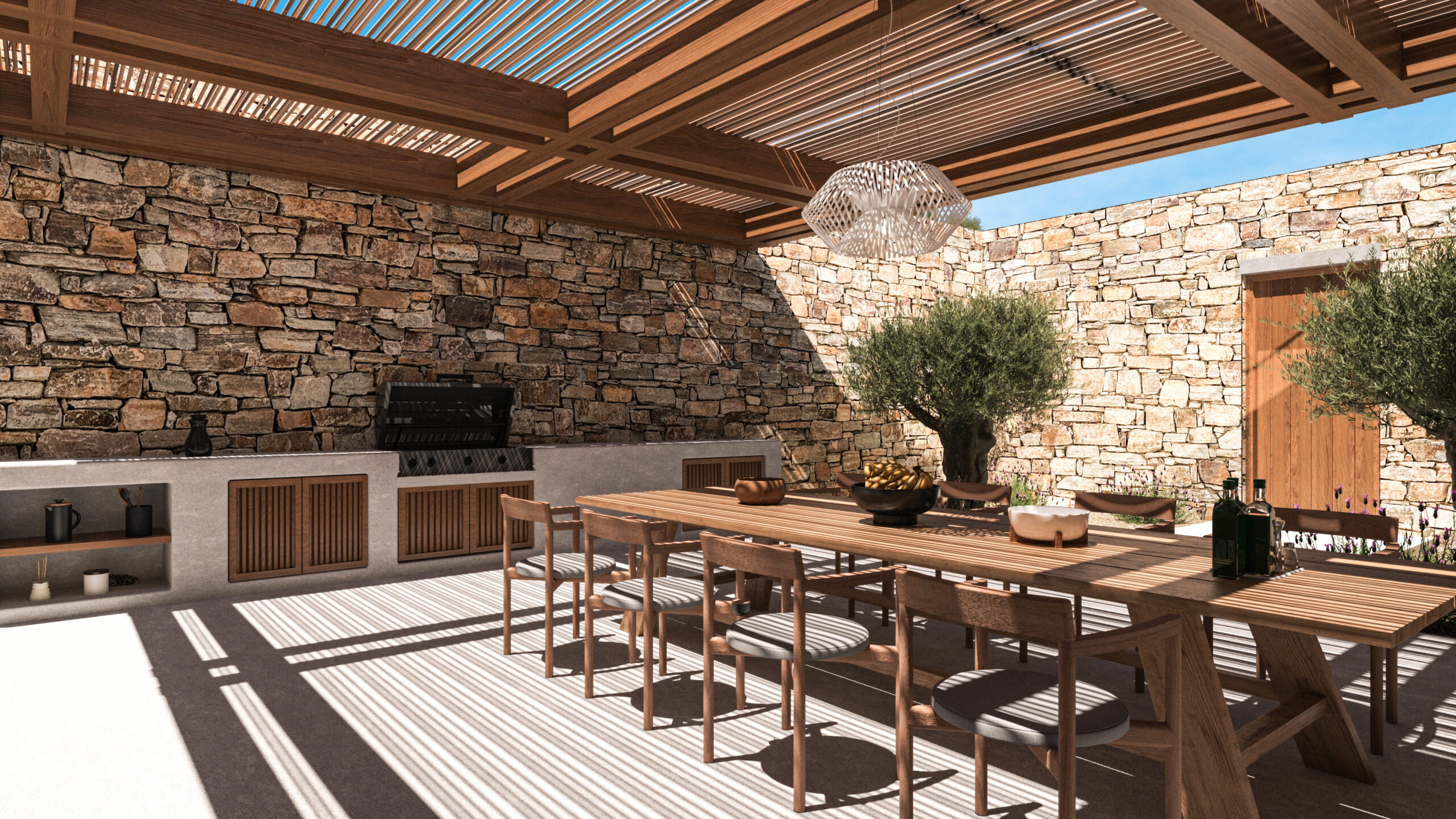 Η χρήση φυσικών υλικών όπως η πέτρα και το ξύλο, καθώς και η οργανική ενσωμάτωση των χώρων στο φυσικό περιβάλλον, ενισχύουν την εντύπωση ότι η κατοικία αποτελεί μέρος της φύσης. Η καλαίσθητη αρχιτεκτονική απλότητα συνδυάζεται με κομψές γραμμές, δημιουργώντας μια διαχρονική και ταυτόχρονα σύγχρονη εμφάνιση.